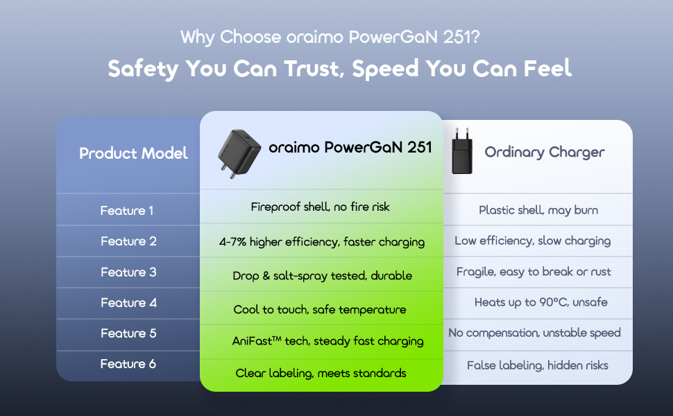 25W Ultra Fast Charging powered by advanced GaN technology with PD 3.0 and QC 3.0 support ensures rapid and efficient charging, while universal compatibility allows it to work seamlessly with all smartphones and tablets, including the iPhone 15/16 series and other USB-C devices. It features built-in 9-layer smart safety protection with exclusive Anifast Technology to prevent overheating, over-voltage, and short circuits. The package also includes a Type-C to Type-C cable that supports fast charging and data transfer speeds up to 480 Mbps.